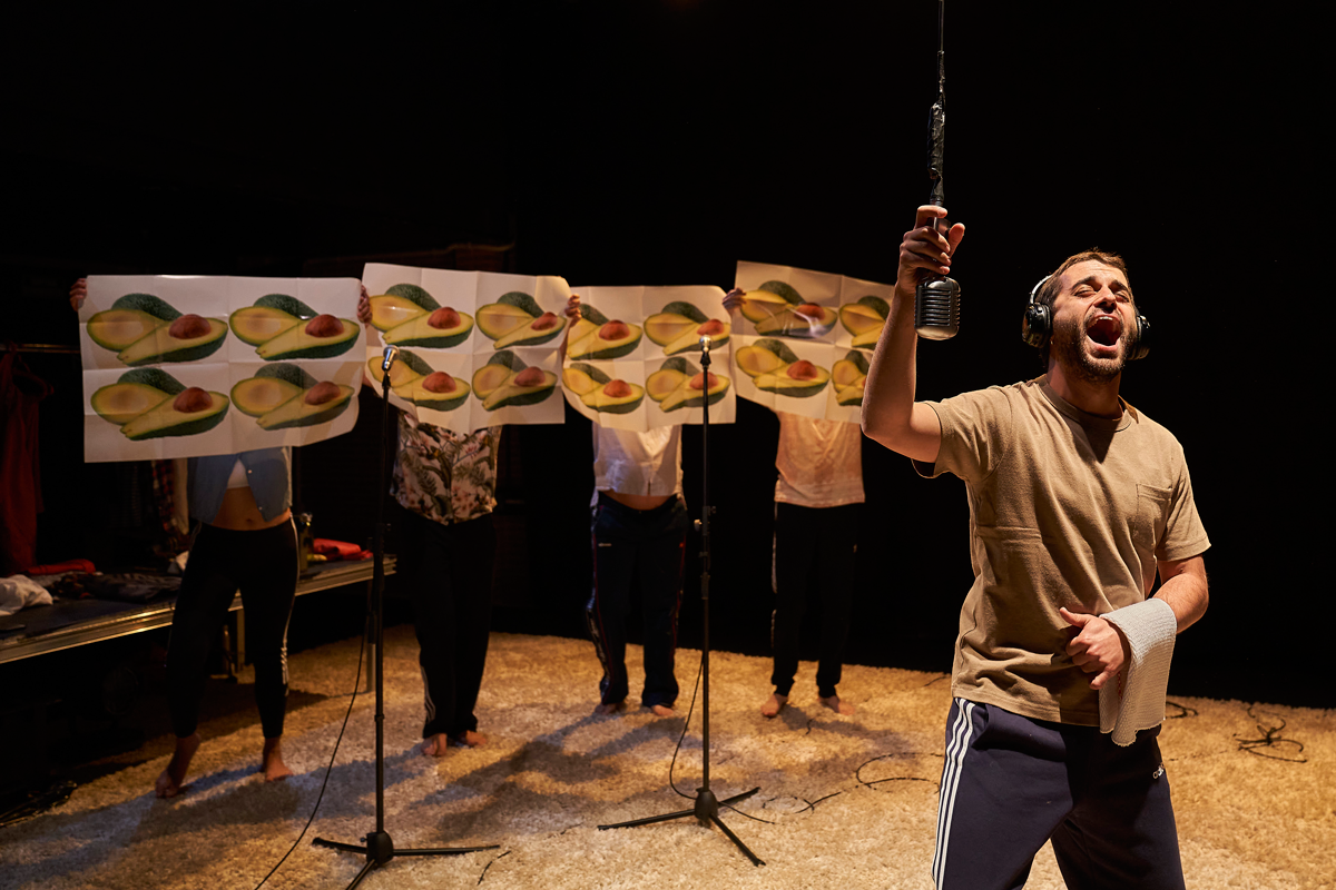 En La ruta de la palta decidimos introducir un nuevo dispositivo técnico para Proyecto Ingenuo. En el espectáculo, invitamos al público a ponerse unos auriculares inalámbricos desde donde recibirán la banda sonora del espectáculo. Ésta se genera en directo sobre el escenario de una manera visible para todos. Tanto la palabra como la música se invocan desde la escena y llegan a la oreja del espectador después de realizar un recorrido a través de microfonía, reguladores de sonido, sintetizadores, samplers… Y cuando llega, hofa de una forma visceral, directa y fulminante que propicia una experiencia inmersiva en la historia. La dramaturgia del espectáculo utiliza documentos, testimonios, fragmentos de realidad pasada. Esta experiencia inmersiva nos facilita que el espectador "viva" en esta realidad evocada de una forma nada racional y muy visceral y nos abre la puerta a recursos poéticos que el sonido tradicional no nos permite.